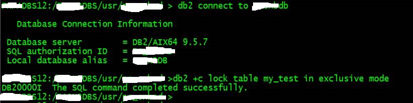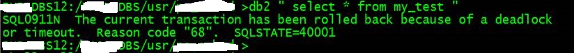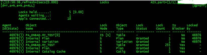 Agent id 为 46976 的LOCK TABLE 应用持有 MY_TEST的表级锁,而Agent id 为 46978的SELECT 应用正处于锁等待状态,等待着LOCK TABLE 应用所持有的锁。