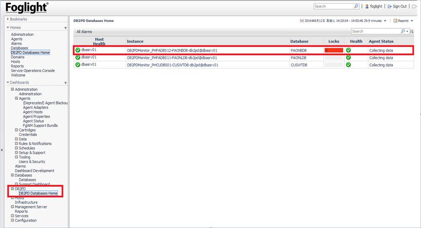 1)打开FOGLIGHT界面,点击左边菜单中的DB2PD Database Home 一项 ,再选择要监控的主机XXXXXDBS12