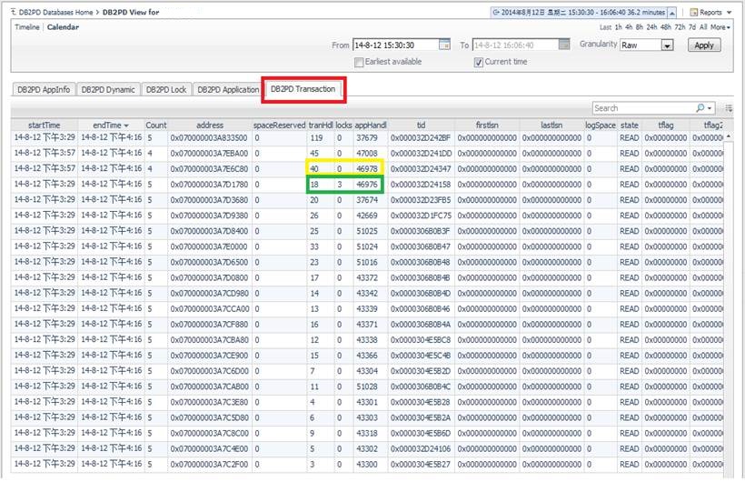 1) 选择DB2PD的Transcation字段,找到tranHdl 40 与 18 所对应的appHandl分别为46978 与 46976